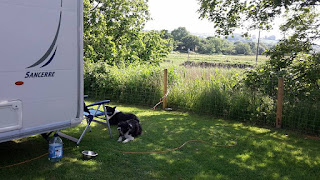 I'm up quite early and take the dogs out for a walk. It's not sunny but it's quite warm, and a couple of laps ensures that my forehead is like Niagra falls and my tee shirt sticking to me. I'm a right mess by the time we head back to the van and bump into Herself's cousin who is also staying on site.