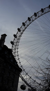 We make it as far as The London Eye, sitting in it's shadow by the ice rink to take stock.