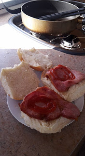 I wake on my own in bed. Herself had to be in work by 7am and had crept out without disturbing me. I gave the inside of the van a bit of a clean up and cooked up myself a treat of a few bacon rolls.
