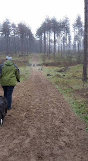 It would appear that our Derek is somewhat off the mark with his work of fiction for today, as the predicted clear up in the skies did not materialise. By early afternoon the dogs are getting cabin fever so we throw on our walking boots and wet weather coats (we remembered to bring them this week) and set off on a hike into the forestry.