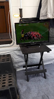 The awning is pressed into service as a rugby viewing room as chairs are crammed in for us to watch the second game being played today.