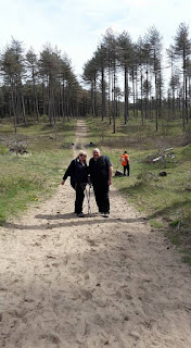 Our rucksacks are loaded with food and drinks and we set off into the country park thankful of the cooling wind. It is noticeable how there are more people about this weekend as we pass the ski slope, through some tunnels and then over the dunes deeper into the forestry. We arrive at the isolated picnic area and am relieved to note that we can hear no chopping. However we are not alone and some inconsiderate gits are sat at OUR table!! We picnic in the lovely sunshine before shouldering our significantly lighter rucksacks to continue on the walk.