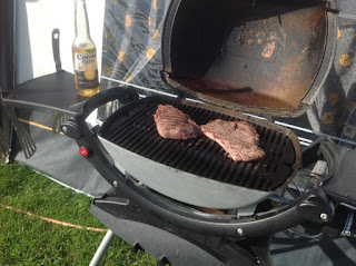 A few steaks are thrown on the Weber while Herself sorted out stuff to go with them. I stayed outside admiring them cook while guzzling Corona and lime.