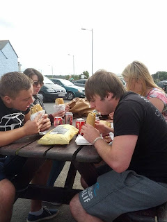 I have to say, we've picnicked in much worse spaces! What a coincidence though, as we are sat on the rugs (remember we are 40 miles from site now) the strange people from the next door climb up onto the grassy bank and sit down next to us. We say hello, and they promptly get up and leave!! Maybe he is writing an on line blog about this strange Welsh family who won't leave them alone, who knows?