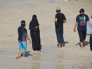 It's very hot by early afternoon, too hot for the dogs really so we make our way back to catch the shuttle bus. The bus stop overlooks the beach and I notice that there is a gathering of Muslim families enjoying themselves on the sands. While the men, although sporting long beards, are dressed in western beach clothing, while the women are restricted to black burqa and jihab. They are attracting some attention.