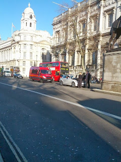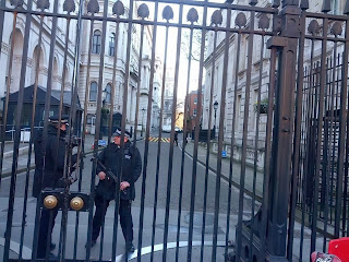 Turning right we made our way past The War Rooms on Whitehall towards the front of Downing Street where the Met's finest has screamed to a halt where a BMW was stranded having broken down - they get a bit twitchy about stationary cars in these parts.