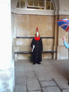 We then walked down through St James' park, stopping briefly for a coffee where the wild life was rather brave, one squirrel being confident enough to climb onto out picnic bench and onto Herself's lap looking for goodies. We strolled through the park down to Horse guards Parade where a lone armed rozzer stood guard over the back of Downing Street.