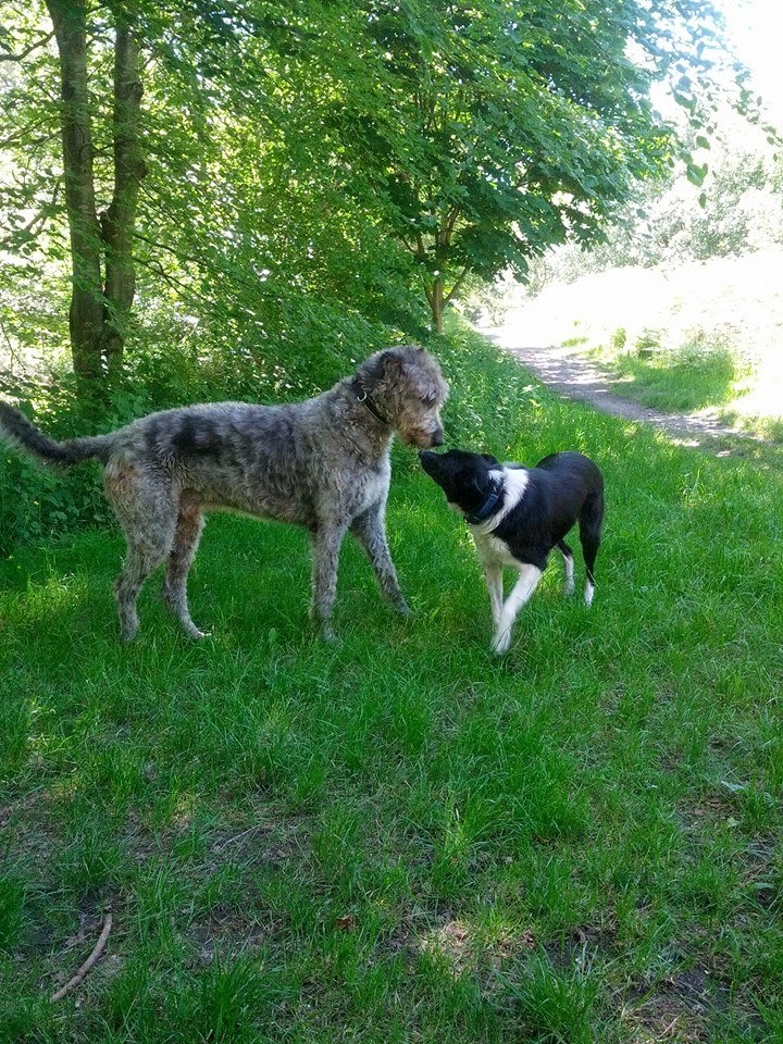 By now Herself's sandals have given up the will to live and one is flapping hopelessly off her foot. We've been walking some time and things start to become a little more familiar to us. We meet a man in the forest who is out with his hound (it's BIG) who is also called Taliesin. Little Taliesin meets BIG Taliesin.