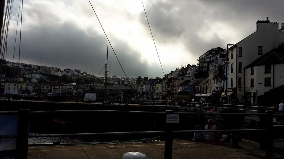First stop is the fishing port of Brixham. The sun is doing its best to come out and the place is rammed, we wander the streets and Herself does a little bit of gift shopping. Everyone seems to be eating a bag of chips, either on a bench or while walking around. I spy a sign daubed with the details of a special offer ans sell it to Herself, on the proviso that I also get a sausage each for the dogs.