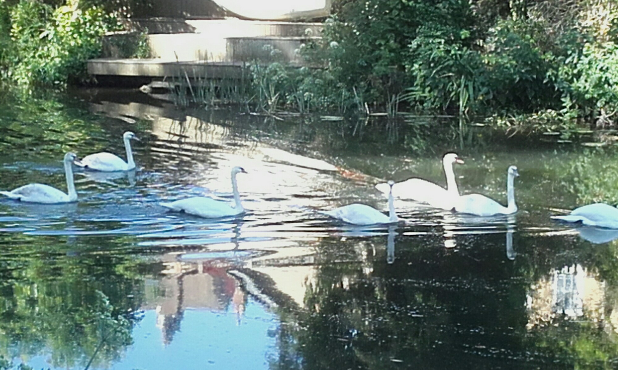I took the dogs out early for a riverside walk this morning and was rewarded by renewing acquaintance with this family of swans. When I saw them a couple of months ago the 6 youngsters still had their brown cygnet plumage - not any more, a fine looking group now, not an ugly duckling amongst them!