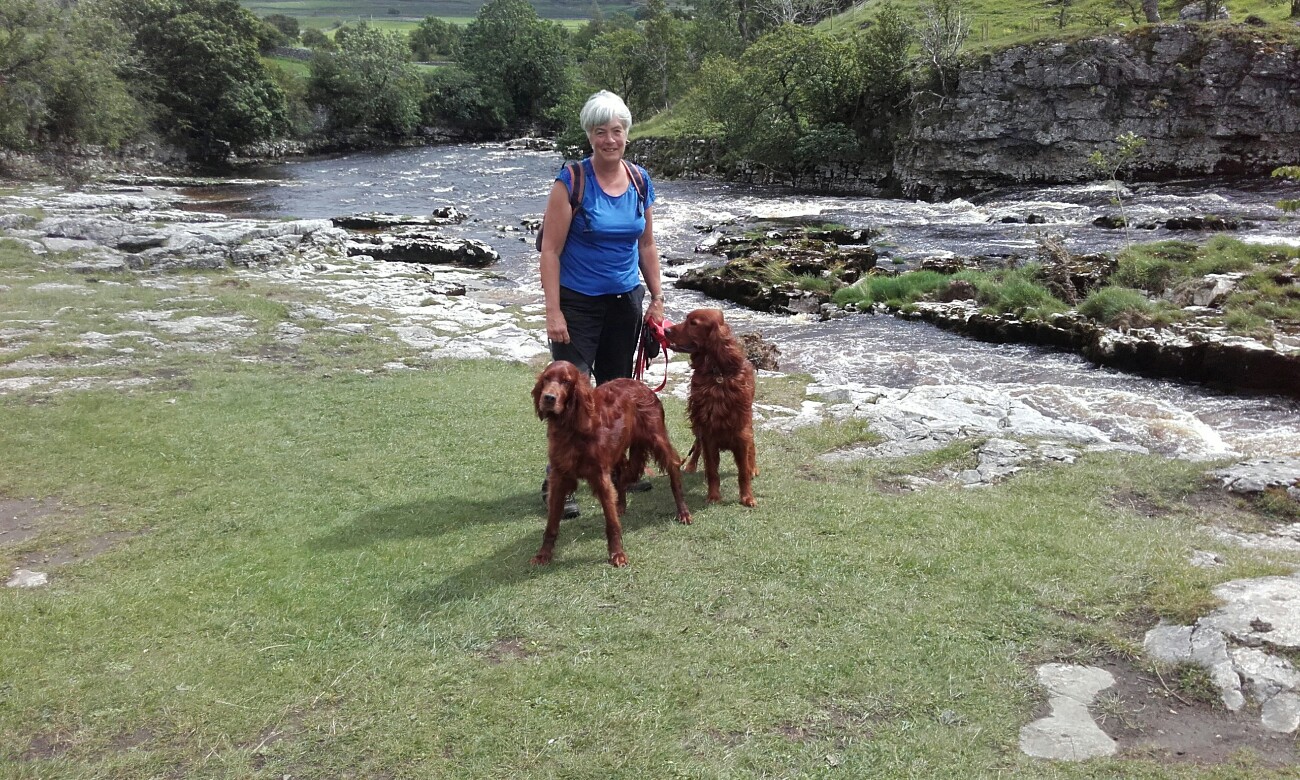 We've had a fine first day in Grassington after some early drizzle cleared. Walked up the Dales Way towards Kettlewell and then back along the River Wharfe which is still quite low at the moment. For those who know the area, the picture is where the river narrows to form a series of rapids at Gaistrill's Strid - didn't quite manage to get everyone posing though - Ralph had his attention on some marauding sheep!