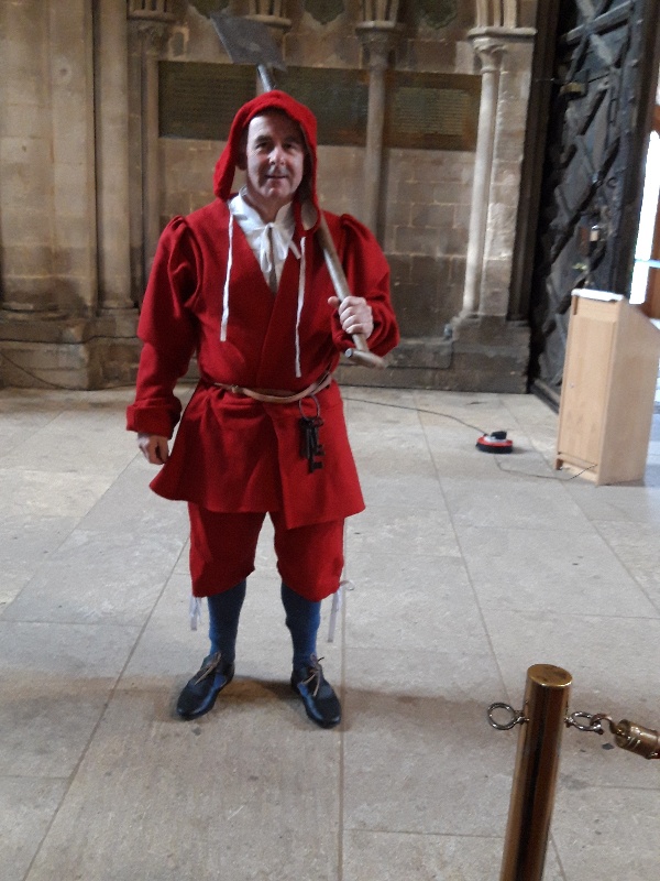 My Co Welcomer dressed up in his Old Scarlet costume today as they were filming for a virtual tour of the Cathedral Old Scarlet.(or Robert Scarlet) was the sexton and grave digger at Peterborough Cathedral and buried both Katharine of Aragon and Mary Queen of Scots.