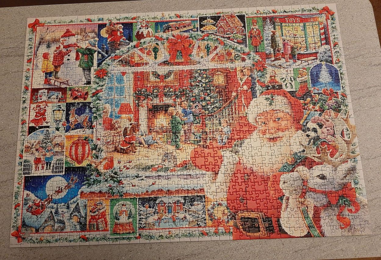 This afternoon managed to finish my latest jigsaw, the Ravensburger Christmas Special edition which I try and buy each year. It was easier than the dogs!!! Strange thing is I have an extra piece!!!