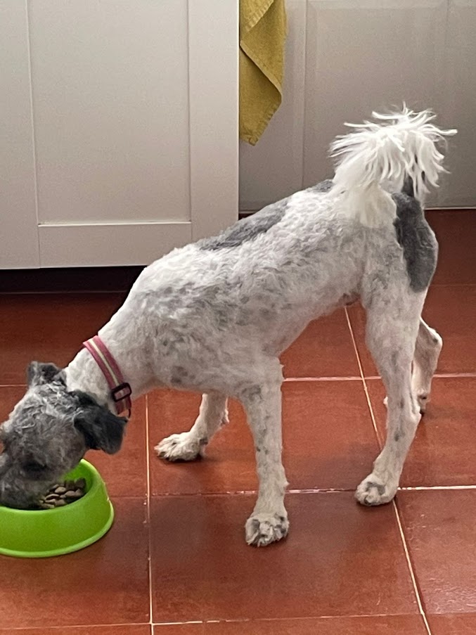 And look what our daughter did to poor Smokey, sheared him poor dog,