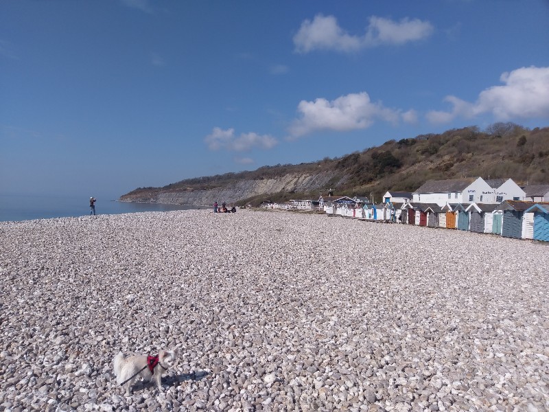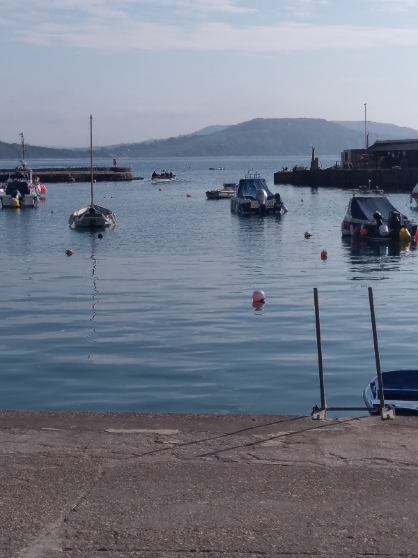 We managed to get down to Lyme Regis this morning, got there for 9 am, both dogs in tow, no fog on the coast. The tide was in and the sea was flat calm, beautiful morning. Not crowded but filling up gradually as we left. Had a take away coffee by the harbour and watched a gig being rowed out. Worth the early effort to get there!