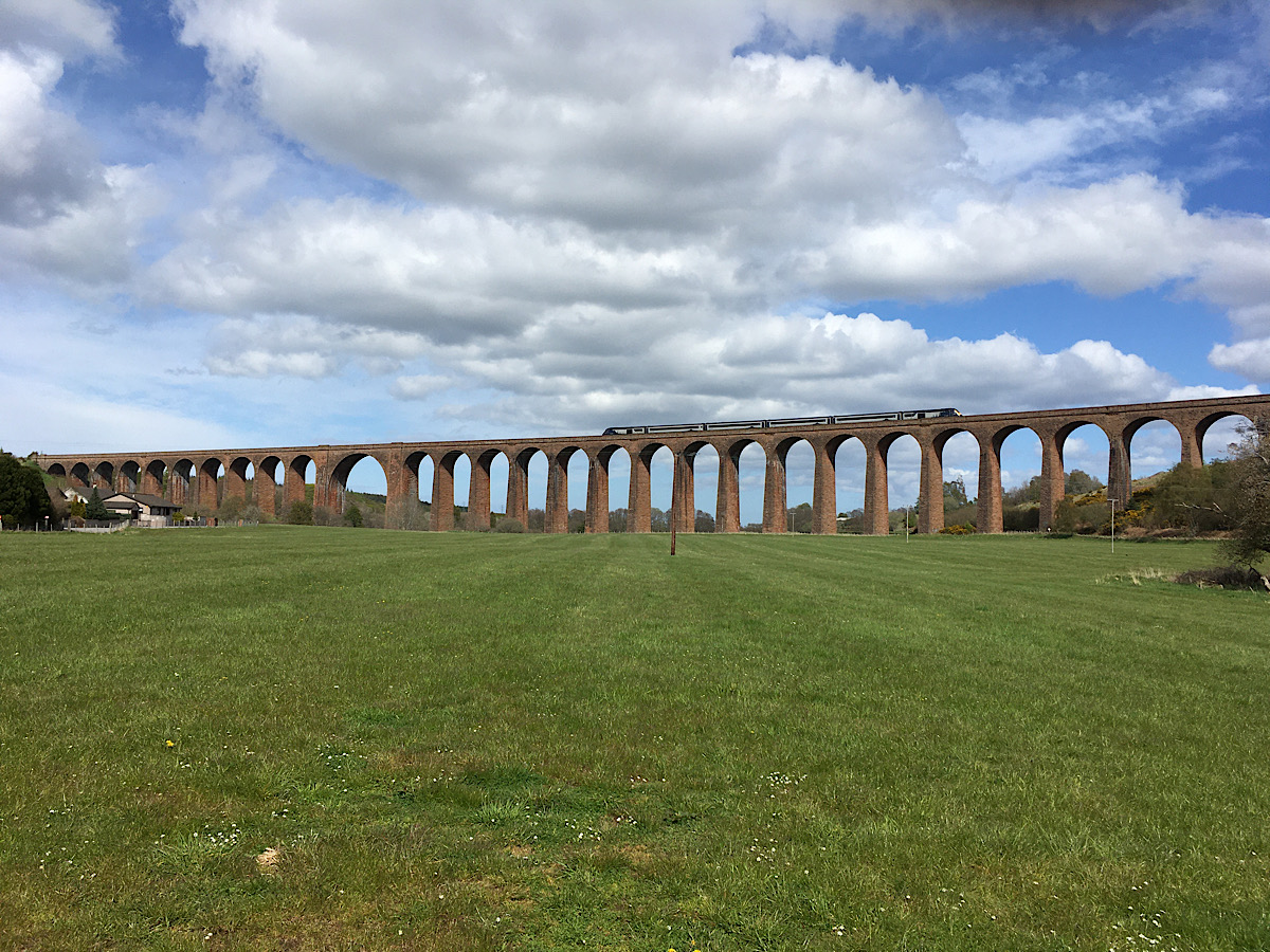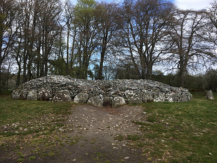 Very wet this morning, which hung on longer than forecast, so waited until this afternoon to go for our exercise. Walked to take a look at four burial cairns. They are only about 2km from the Culloden battlefield, as the crow flys, but are much older, by almost 4000 years. A really impressive nearby viaduct takes the main north south railway line over the river Nairn. The train is the 3:20 into Inverness, having just completed its transit of the Grampians.
