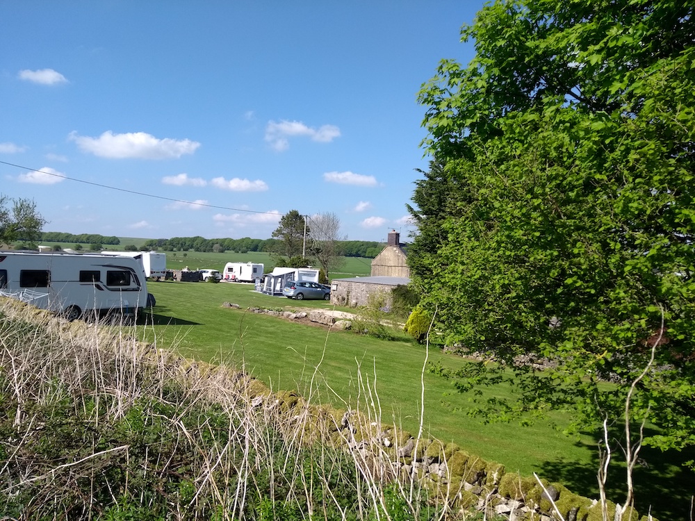 ) and we've had a few problems with drawers in the caravan coming loose. We've secured them as best we could but pulled into the first available lay-by, which was 12 miles down the road. Couldn't find the caravan keys anywhere. Looked down for some reason at the hitch between car and caravan and there were the keys resting on the handle of the jockey wheel. They must have fallen out of my pocket when hitching up 12 miles beforehand. And there we were worrying about internal drawers coming open (they didn't) and the keys had travelled over atrocious terrain stuck like that. I've taken a photo of where they were but after we arrived on site.Other photo is of the CL. We're in the corner with a cracking view. CL is lovely, well kept and well used. We've been trying for ages to get on. Had a cycle late afternoon down past Parsley Hey to the Royal Oak pub and indulged with a GF Sticky Toffee Pudding and Ice cream and a glass of cider. Mrs WN had to go with Bakewell Pudding and Custard though seeing as we're in Bakewell land.
