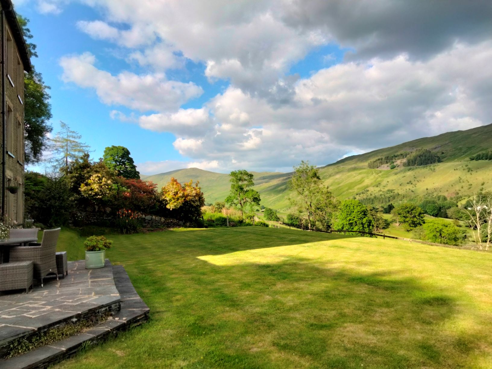 Blue skies from the word go today. So breakfast was out on the lawn with this view up to Causey Pike.