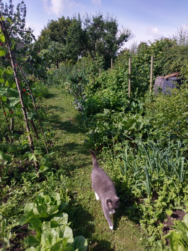 The cat and I have been out in the veg garden this morning, there is a lot to do out there. He's lucky, he can just curl up amongst some warm plants. The blackbirds are heading towards the currants. Too much to do! OH says we should never go away in June and July....he's probably right.