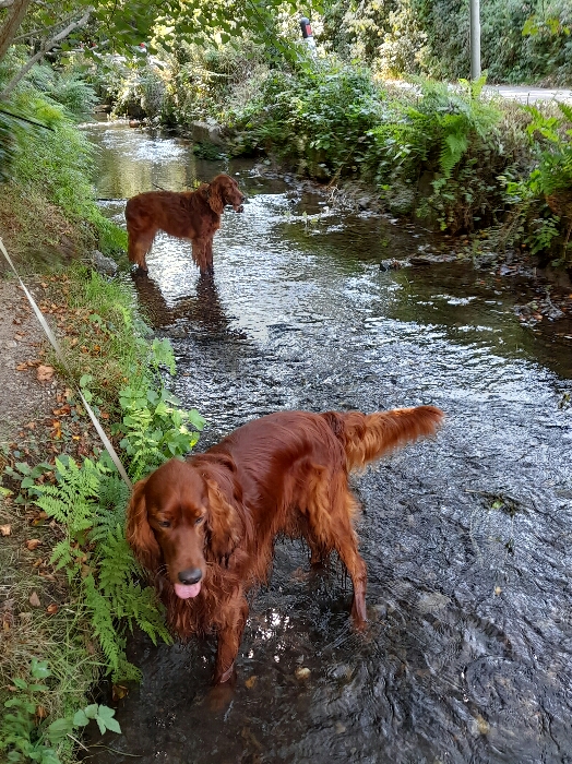 Cornwall may be crowded and the crowds may be down in Perranporth getting fleeced for car parking and baked on the beach .... meanwhile we just drove 1/2 mile down to Perranwell, parked for free and walked down the lovely shady footpath to Bolingey where, just a mile or so away from the beach the dogs could enjoy a relaxing paddle!