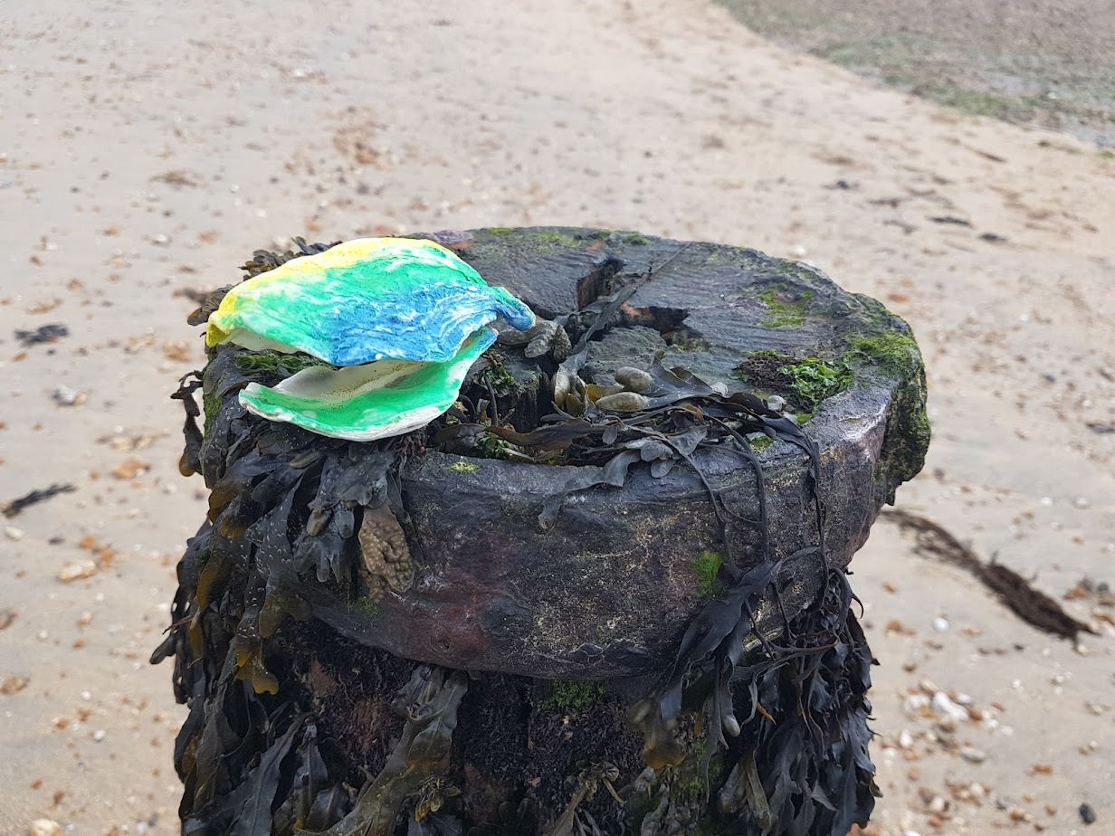quite a stunning day today with a great cloud formation over the IOW, found lots of painted oyster shells this morning, not quite sure why, my first thought was something to do with Ukranian flag but not sure where the green fits in.