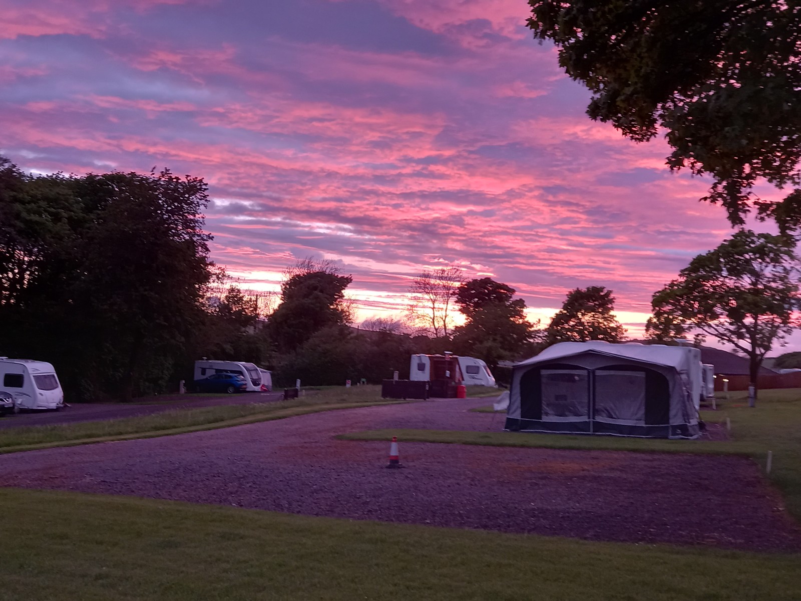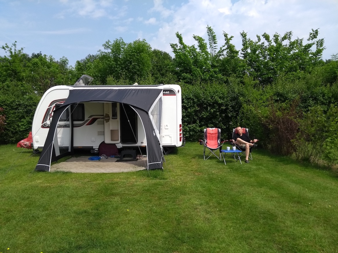 It was an easy drive on excellent roads and we arrived about 15 minutes after site re-opened in afternoon. Placed on a comfort pitch, same as serviced, except this one is on grass but with nice hedges at head height to give one a bit of privacy. Halfway through setting up when the heavens opened and a thunderstorm sped over us, so we obviously waited it out in the caravan.