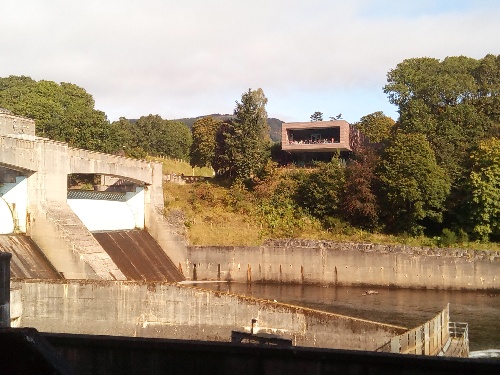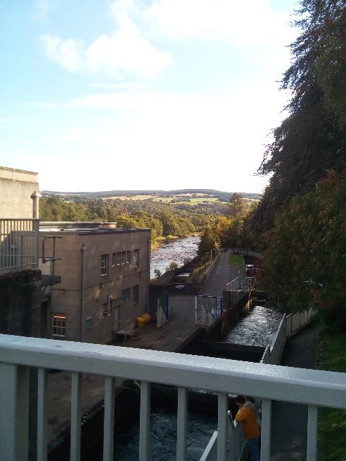 Lovely sunny day in Pitlochry. We walked up to the Tummel Dam and salmon ladder. Viewing the salmon via the underground windows has been stopped. You now have to stagger up the many steps to the "box" cafe, adjoining the tourist car park and watch the salmon on film. Not quite the same. We've done it previously so just turned tail and enjoyed a lunch we'd booked at Portnacraig followed by an afternoon seeing a stage version of "Summer Holiday" at the Festival theatre. Oh goodness, that was a trip down memory lane.